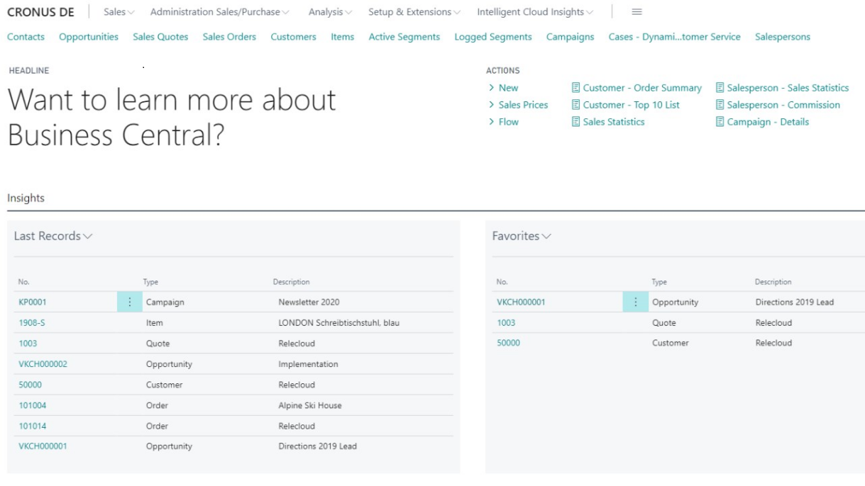 Sauvegarde des enregistrements comme favoris directement dans le tableau de bord de Microsoft Dynamics 365 Business Central.